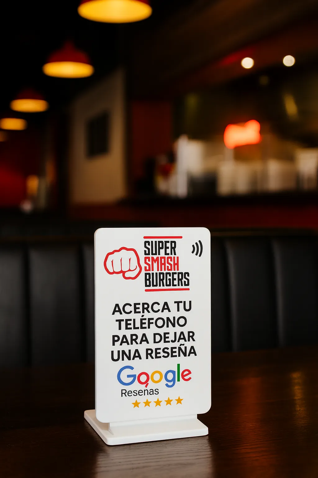 Colocamos tarjetas NFC en tu restaurante: tus clientes acercan su celular y dejan su reseña en segundos. Las reseñas positivas se envían automáticamente a Google para hacerse públicas, mientras que las negativas se notifican internamente al negocio, evitando que afecten tu reputación.